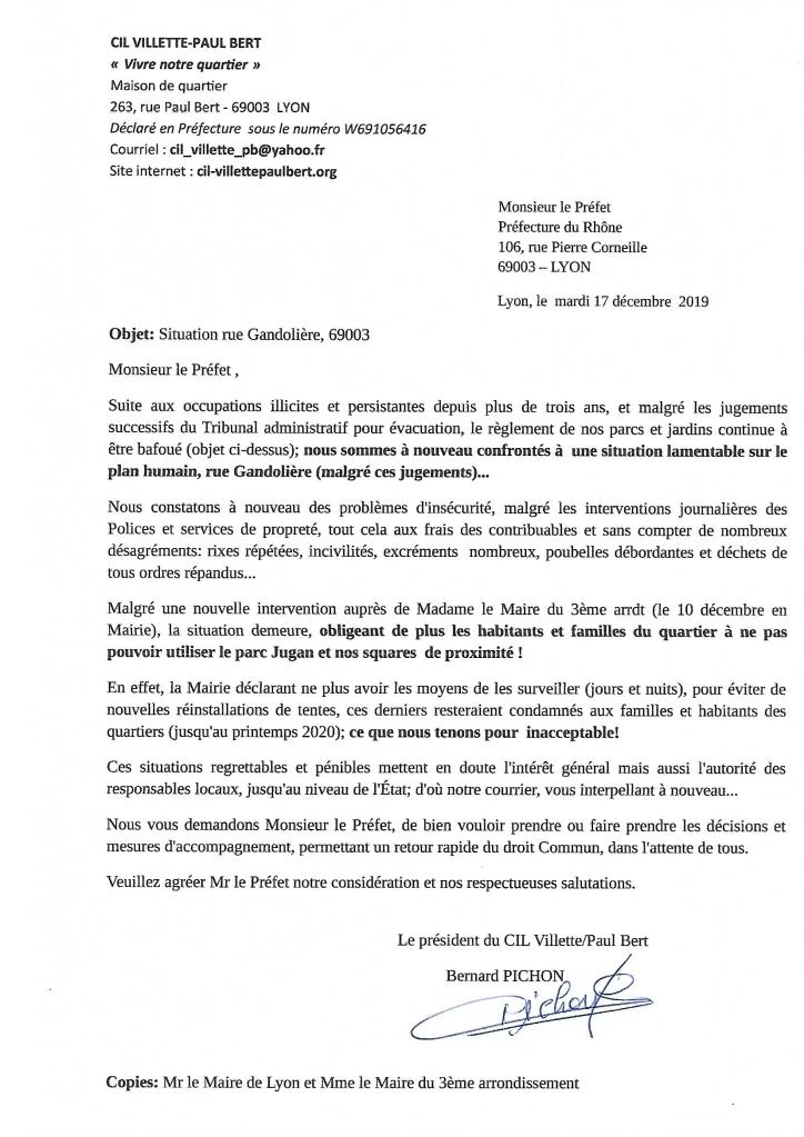 Le CIL a écrit à Madame Catherine PANASSIER Maire du 3ème, à Monsieur Gérard COLLOMB Maire de Lyon et au Préfet du Rhône mais cela n’a servi à rien. Les demandes des habitants n’ont pas été entendues. Maintenant, le CIL écrit à l’élu en charge de la sécurité, de la salubrité et la tranquillité à la Mairie de Lyon, Monsieur Jean-Yves SECHERESSE. Se sentira-il plus concerné ? Telle est la question …..